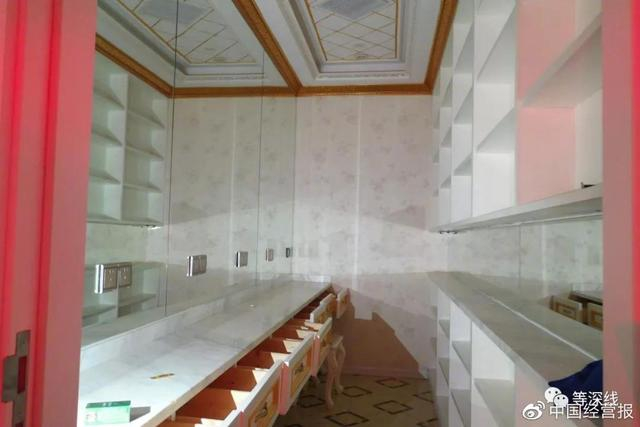 7美化妆间。依旧以白色和金色为主,能同时容纳7人化妆。该化妆间及与其紧邻的4人盥洗间、洗澡间,图左下角是狐臭喷剂,未开封。《等深线》记者程维摄