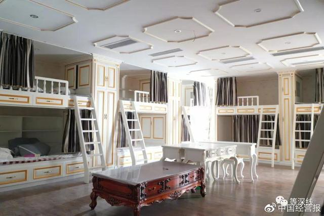 穿过2号房间的暗道,空间豁然开朗,这是一个可容纳14人住宿的集体闺房,装修风格依旧为白底嵌金,配以紫色软包、灰色床帘,有恬淡、雅致和轻奢的味道。14美的闺房如此雅致、有格调,也彰显了他们所服务的客人的尊贵程度。《等深线》记者程维摄