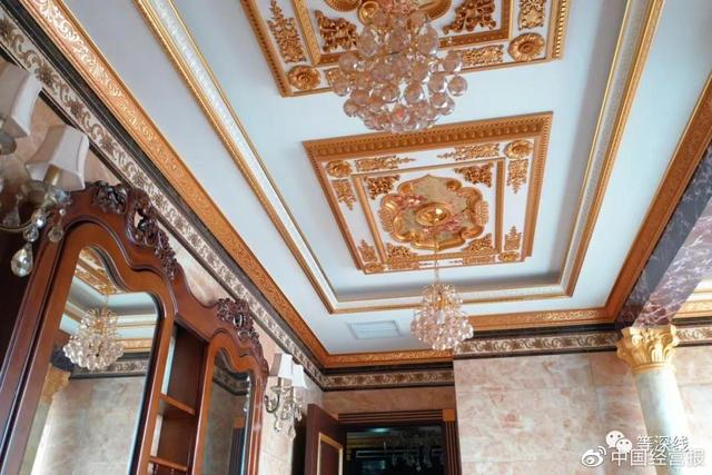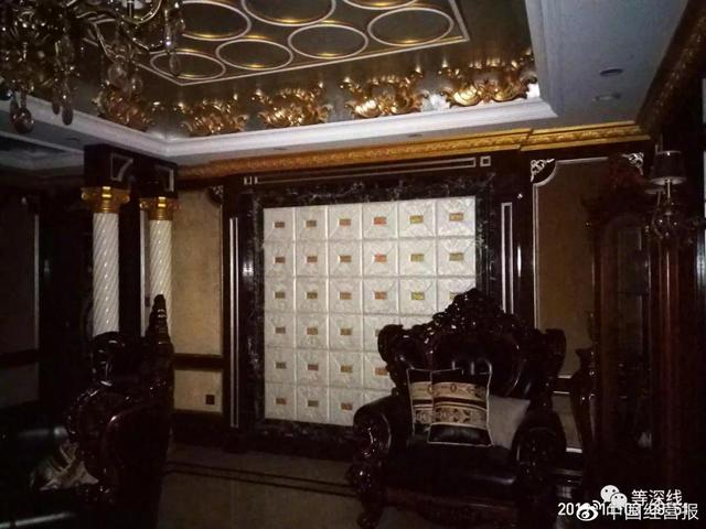“暗黑客厅”的左侧(西北侧)墙壁及凌乱摆放的木雕真皮沙发。此客厅无自然光线进入,且客厅的正面为一块巨幅黑色带纹路的花岗石,更显得该公用客厅有一丝庄重、沉稳的氛围。但这一氛围,在金碧辉煌的屋顶、吊灯、墙壁、家具等富贵之气辉映下,体现出一种特殊的奢华。《等深线》记者程维摄