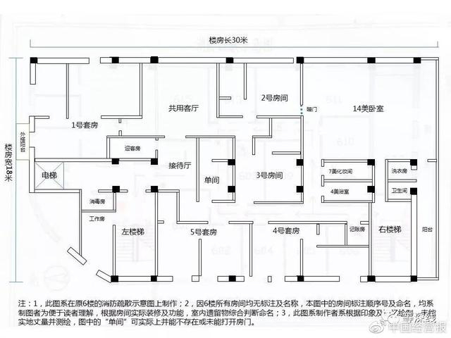 为便于向读者展示,记者在本文中根据实地查看情况,以及装修、设备设施、功能配置,特别是遗留物性质等,对该楼内的各个房间(或套间)予以编号,并命名,以便快速理解该楼层概貌。