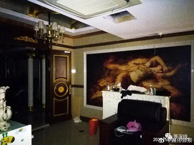 6楼出电梯后的“接待厅”。该接待厅的最大特色是,正对电梯出口的墙面上,挂有一幅巨幅半裸美女。《等深线》记者程维摄