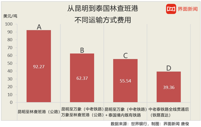 以昆明到泰国林查班港(曼谷旁的港口)为例,如果全程采取公路运输,每吨的运费为92.27美元;如果昆明至万象采用铁路,后续使用公路运输,每吨运费为62.37美元,将下降32%。