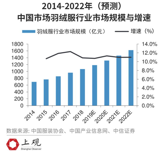 可以预测到,未来的几年将会是国内羽绒服市场扩张的高速成长期,中信证券的报告指出,中国羽绒行业市场规模将达到1622亿元。羽绒服行业定价的天花板已经被打开,国产品牌如果能抓住市场需求,实现高端化品牌升级,或许能重现国产品牌往日的辉煌。