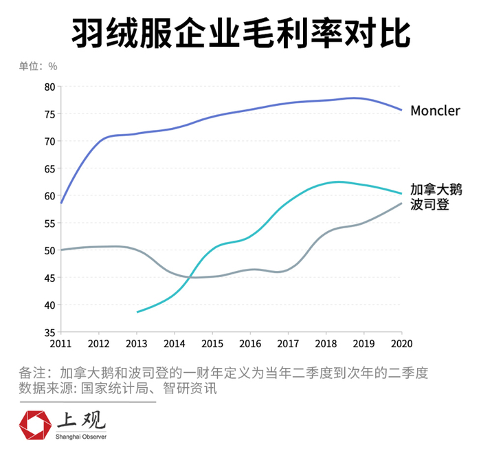 相比之下,中国服装家纺行业的平均毛利率仅在40%左右,最有竞争力的国产羽绒服品牌波司登毛利率也才45%,远不及加拿大鹅的60%和Moncler的75%。