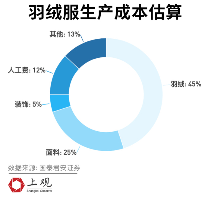 一件羽绒服的成本有多少?根据国泰君安的数据显示,生产过程中,原材料成本约占总成本的75%,包括羽绒(45%)、面料(25%)和配饰(5%);劳动力成本约占总成本的12%;其他运营成本约占13%;所以羽绒价格是影响羽绒服成本最关键的因素。