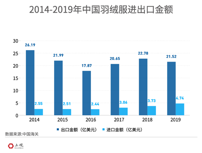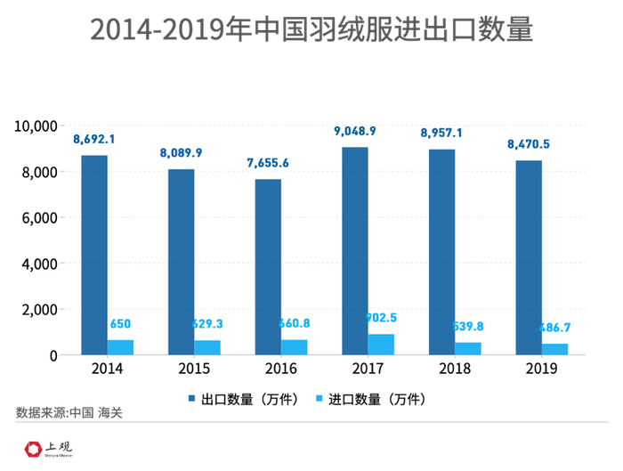 海关数据显示,我国一直以来都是羽绒服出口大国,疫情前的2019年中国制造出口了8470万件羽绒服,进口486万件,出口数量为进口数量的近20倍,但这一年羽绒服出口金额仅为进口金额的4.5倍,充分说明我国羽绒服制造仍处在国际产业链底端,生产能力强却卖不上价。