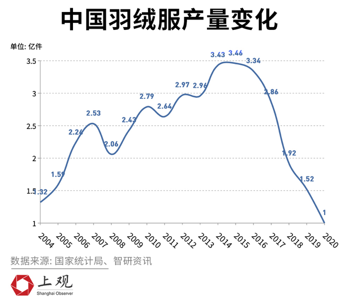 而对国产羽绒服来说,前些年高歌猛进的产能,已偷偷埋下过剩的种子,在大量库存无法消耗后,产量从2016年开始快速下滑,到了疫情前的2019年,全年的羽绒服产量仅有1.52亿件,几乎回到了2005年的产量水平。
