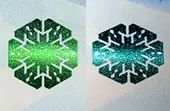 位于票面背面下方。改变观察角度,“雪花”图案的颜色在绿色和蓝色之间变化,并可见一条亮光带上下滚动。防伪特征效果见下图。