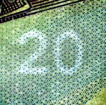 位于票面正面面额数字左下方。透光观察,可见透光性较强的面额数字“20”。防伪特征效果见下图。