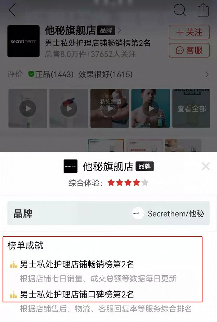 在拼多多平台,根据店铺七日销量、成交总额等数据,他秘旗舰店入榜男士私处护理店铺畅销榜第2名以及口碑榜第2名。