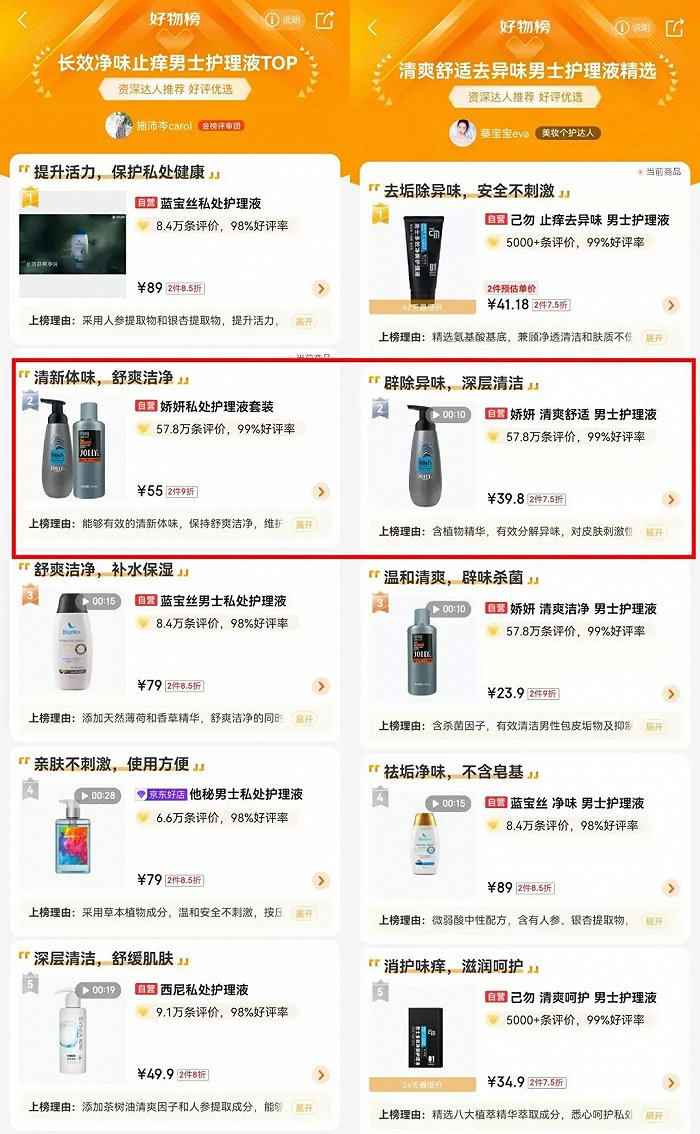 根据男士护理液的不同卖点以及功效,京东好物榜也更加细分,如“长效净味止痒男士护理液TOP”、“清爽舒适去异味男士护理液精选”等等。登顶“长效净味止痒男士护理液TOP”榜前五的产品分别是蓝宝丝(Bluetex)私处护理液(提升活力保护私处健康)、娇妍私处护理液(清新体味舒爽洁净)、蓝宝丝男士私处护理液(舒爽洁净补水保湿)、他秘secrethem男士私处护理液(亲肤不刺激使用方便)、西尼私处护理液(深层清洁舒缓肌肤)。其中,娇妍男士私处护理产品的消费者评价多达50万+条,好评率达99%。