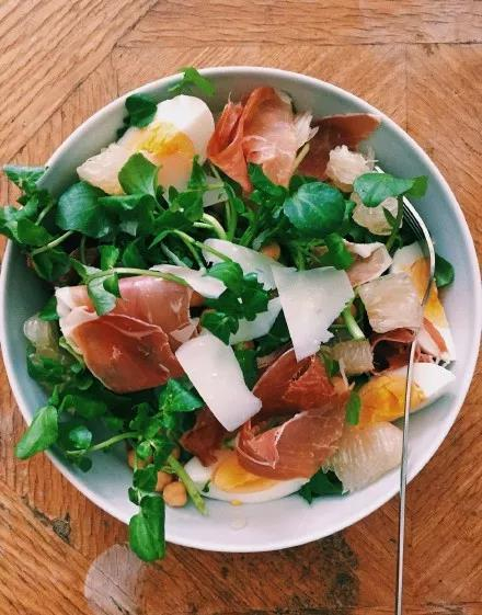 ·豆瓣菜洗净,取嫩芽,红心蜜柚取果肉,掰成小块放入沙拉盆中。放入核桃碎和培根碎,淋上沙拉汁拌匀即可。