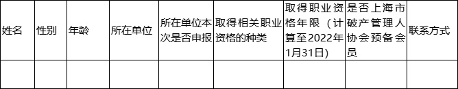 7、本次自然人申报基本信息材料如下:姓名、性别、年龄、所在单位、所在单位本次是否申报、取得相关资格的种类和年限(专职执业律师、注册会计师、专职清算师或具备中级会计专业资格以上)、是否是上海市破产管理人协会预备会员、联系方式。具体申报表格详见附件3。