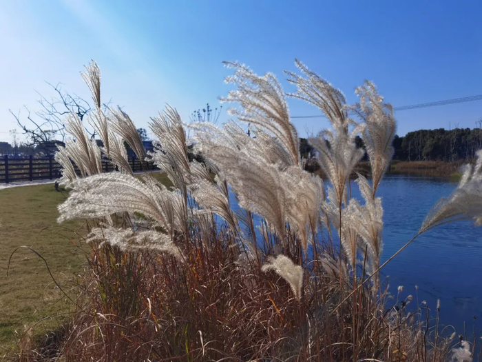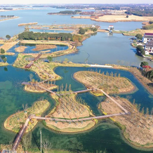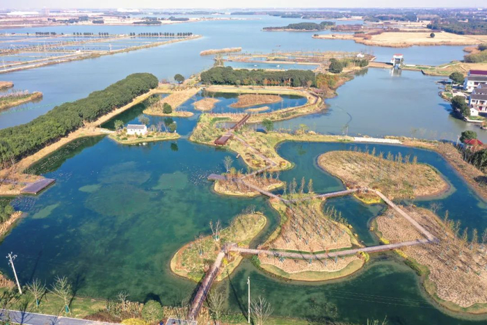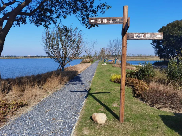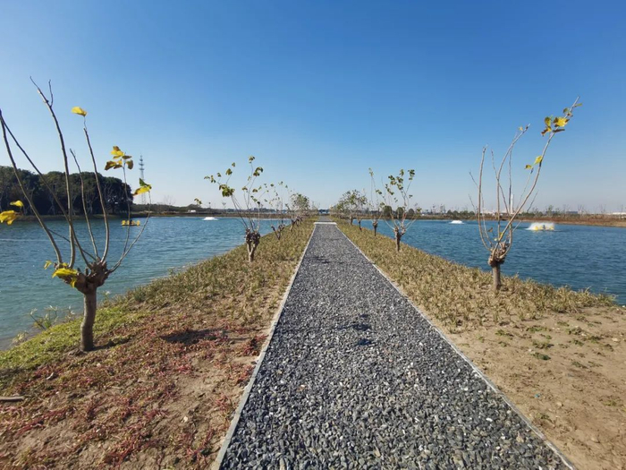 从空中俯瞰江南圩田样板区,水面连绵不绝,岸边绿树成荫,白墙黛瓦的的民居与江南圩田相望,小岛、连廊栈道点缀在如镜面的湖水上。步入样板区,仿佛走进了一个生态公园,清澈的水体让水底的水草清晰可见,这里不仅保留了原有1500株林地和行道乔灌木的自然生态基底,还选取49种乔木、32种灌木、43种草本地被、21种湿生水生植物进行示范种植,形成天然的种质资源库。“原乡湖光揽胜”“圩田踏青寻芳”两条核心游览环线也已建成,沿途设计“十月秋荷”“樟林绿荫”“雪漾落照”“芳草洲上”等四大观赏节点,实现江南生态鱼米水乡风韵。