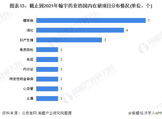 截止到2021年6月底,在境内范围内,公司共有18项在研药品;分别分布在糖尿病、消化、妇产生殖、骨质疏松、免疫、内分泌、特发性帕金森病、心血管和止痛方面。其中,在糖尿病领域公司共有5个项目处于在研,4个项目属于消化领域,妇产生殖领域有3个在研项目。