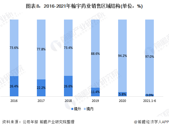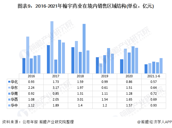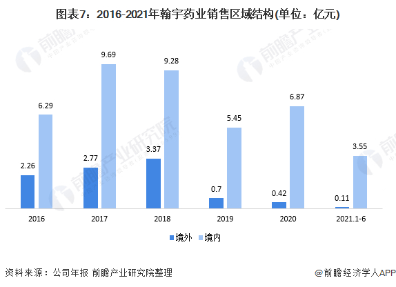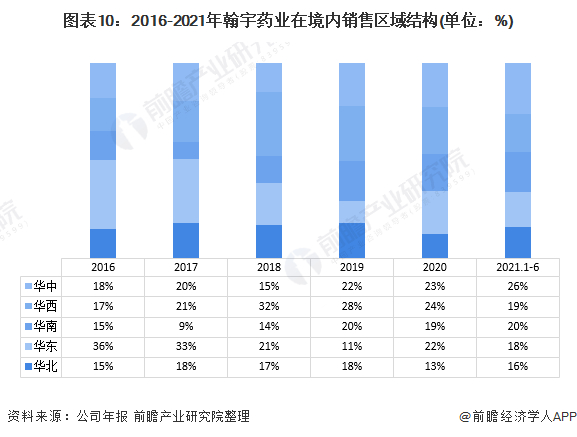 具体来看,翰宇药业的国内销售结构较为均衡;但值得注意的是,华中区近年来销售收入呈现波动态势,但从整体占比来看,华中区的销售占比近年来呈现逐年上升态势。而曾作为顶梁柱的华东地区,在2019年已被华中、华西超越,但在2020年将差距拉小。