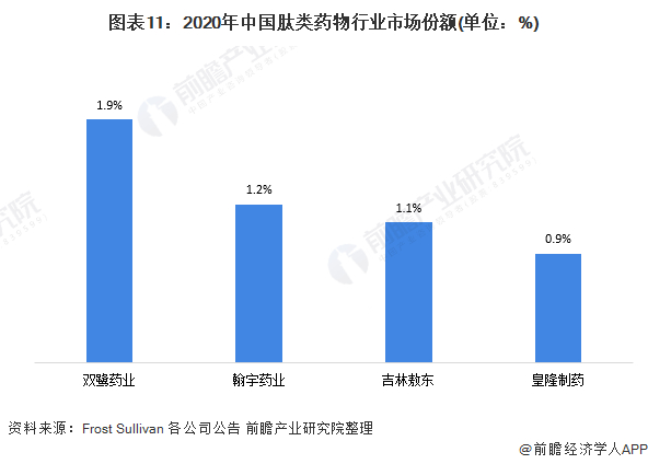 根据Frost&Sullivan的数据,2020年,我国肽类药物市场规模约为85亿美元。依据各公司企业年报所公布的数据对肽类药物行业市场份额进行测算分析,分析结果如下:2020年,双鹭药业的市场份额达到了1.91%;其次是翰宇药业,达到了1.25%;再者是吉林敖东,达到了1.1%。