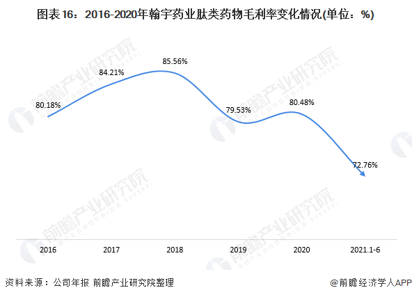 从毛利率上看,2016-2020年,翰宇药业毛利率整体呈现出波动下降的变化趋势,但仍保持在较高水平;2020年,翰宇药业肽类药物毛利率仍达80.48%,企业盈利状况较为可观。