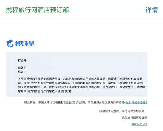 最终携程向叶女士发送了一封邮件,表达了歉意,并表示已查过此事,代理商回复称“是和酒店预订部正常预订的并提供了与酒店预订的支付房费的相关记录”。