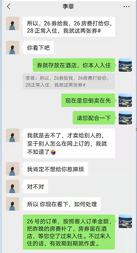 叶女士并不认识这个所谓的“李菲”。在叶女士因换房问题与酒店沟通之后,酒店初步认定“李菲”的房券可能是代理商从某些渠道低价转让来的。9月27日,酒店方面通知“李菲”,之前房券作废,同时要求“李菲”补交9月26日的费用,当天,酒店收到该笔款项。
