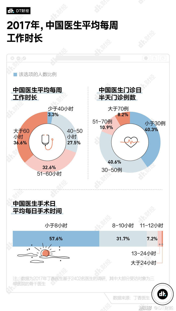 这段进击之路,常常是由无数个病例和不眠夜组成的。丁香医生2017年的一项调研显示,高强度、长时间工作是医生们普遍面临的问题。