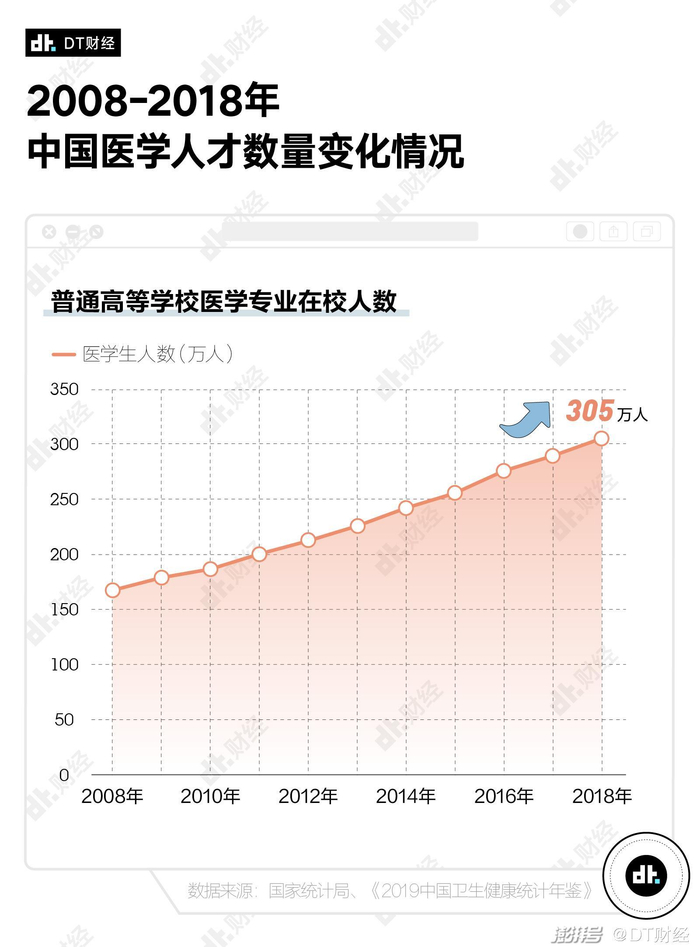 《2019中国卫生健康统计年鉴》显示,2018年中国普通高等学校医学专业在校人数,达到了305万人。这个数字,相较2008年上涨了82.3%,如今仍在快速增长。