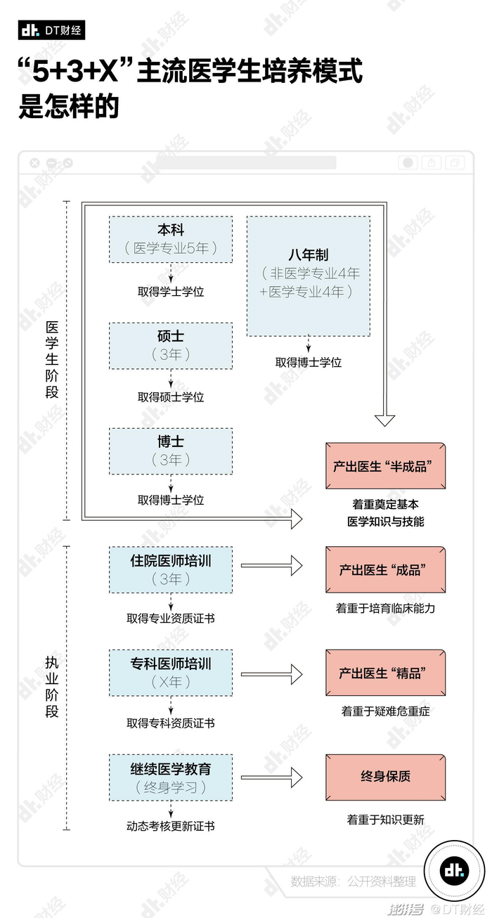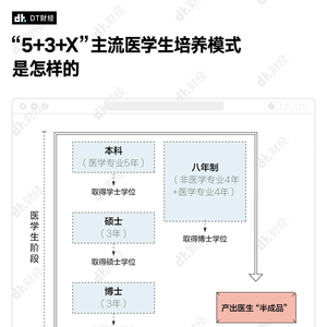目前来说,中国医学生的主流培养过程是“5+3+3”。5年制本科,3年硕士,3年博士。要成为能独立行医的临床医师,必须经过“3+x”规范化培训,即3年住院医师规范化培训和2-4年专科医师规范化培训。道路千万条,成功的路只有一条,就是学中干,干中学。