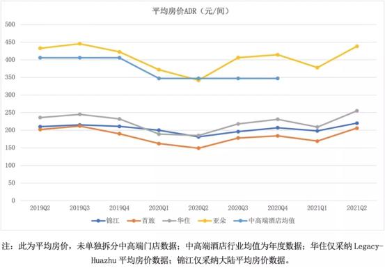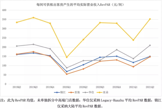 其实在疫情之前,经济型酒店入住率会相对高于中高端酒店。而截至2021年第二季度末,锦江旗下已开业酒店中经济型占比为50%;首旅旗下酒店经济型占比为45%,亚朵旗下没有经济型酒店。所以在入住率这一数据维度上,如果以“老眼光”来看,锦江、首旅应该是占据一定优势的。