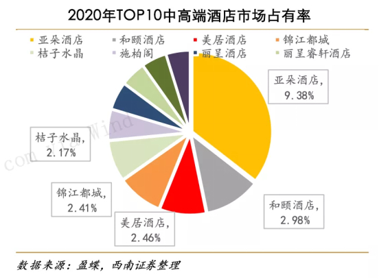 比较完5项核心指标,最后再来看看市场占有率情况。据西南证券测算,2020年,TOP10中高端酒店市场占有率为26%,其中亚朵市场占有率约9%,排名第一。