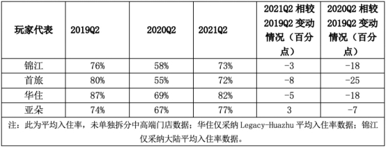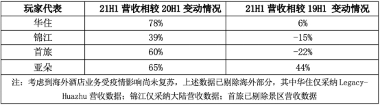 2. 聚焦到恢复情况上可以发现,与旗下拥有经济型、中端、中高端等多种酒店类型的华住、锦江、首旅相比,聚焦中高端酒店类型的亚朵业务恢复程度最高,其2021年上半年的营收相较2019年上半年实现了44%的增长。