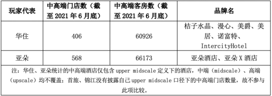 以上的数据反映的是华住、锦江、首旅、亚朵整体门店数的情况,在此基础上,我们进一步挖掘了单独的中高端门店的情况。数据显示,截至2021年6月底,亚朵中高端门店占比约87%,达568家;华住中高端门店占比约6%,达406家。即,不论是从展店速度,还是中高端酒店绝对数量来看,亚朵均高于华住。
