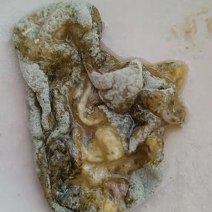据程先生介绍,那块异物展开来约有一张公交卡的大小,闻上去有一股发霉的味道,外层泛白、里面发黄发绿,“又软又烂,不知道已经泡了多久。”瓶盖显示,这瓶果粒橙的生产日期为2021年9月23日,并没有过期;瓶身无异样,但向瓶底看去,程先生发现还有一片橙黄色的物体粘在上面,闻着也是一股发霉的味道。