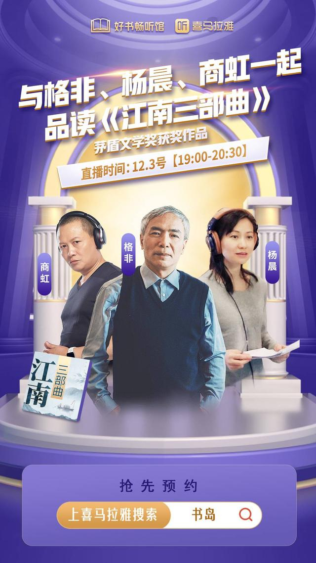 其中,《江南三部曲》有声书特地邀请了知名演播人杨晨、商虹联袂播讲。12月3日晚上7点至8点半,喜马之夜晚会播出的同时,格非、杨晨和商虹还为听众带来了联合直播,一起品读这部作品背后的故事。