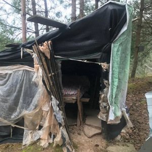 低矮的棚屋立在山梁上,由几根木棍作支架,竹片作门,两道铁丝勾成锁,再用广告布、油布、和防晒网潦草铺盖。一张床占据了不足三平方米棚子的一大半。床的一边也挂着一块铁片,为了让铁片的声音传出去,床头边的覆盖物只有透风漏雨的防晒网。另一边的椅子上放着燃尽的蚊香、灭虫剂和花露水,椅背上歪斜着撑起一把伞——雨夜时它能遮挡一部分雨水。