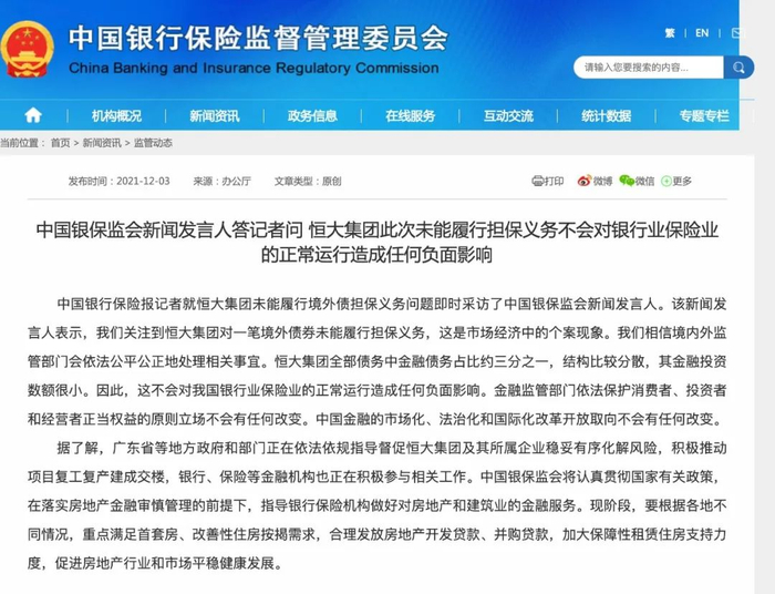 银保监会:恒大未能履行担保义务