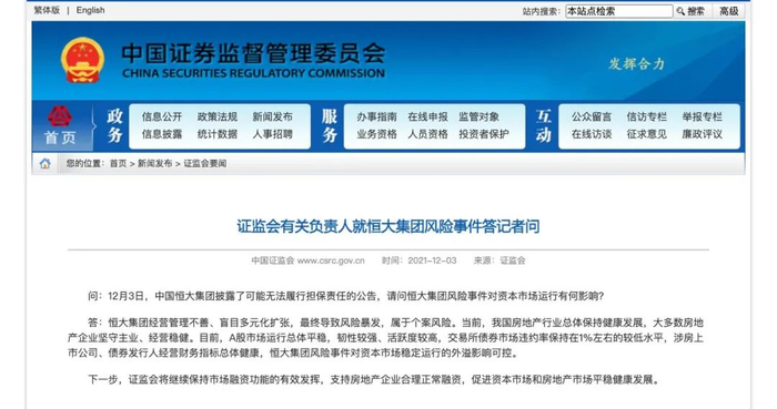 据证监会消息,12月3日,证监会有关负责人就恒大集团风险事件答记者问。