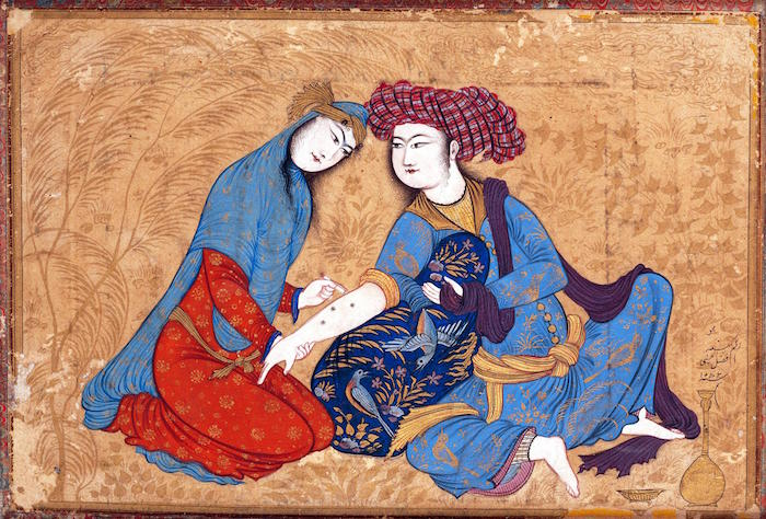 阿夫扎尔·侯赛尼是萨法维时期(1501-1735)著名细密画艺术家,师从细密画大师礼萨·阿巴斯(Reza Abbasi)。这是他创作的一幅代表性作品,画中的焦点是一对情侣,而装饰背景则被金色的树叶遮住。这位女子在恋人的手臂上留下了爱情的“烧伤痕迹”,在萨法维王朝时期,这是情人之间真诚和忠诚的标志。