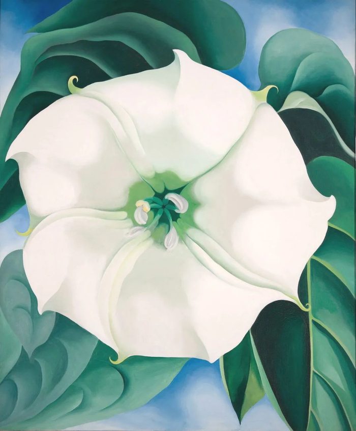 在她的笔下,神秘总是与之相伴,她觉得我们不应该低估“花朵”,也自认为无法和别人一样用同一种方式去描绘它们,“它们在这些人的眼中是如此脆弱、纤细”…… 而欧姬芙尊重花,不但带着细致入微的注意力去观察它们,她说:“我们需要以一个作为居住在摩天大楼里的现代居民来看待它们,我们现在所处的环境,早已不同以往,这些被大厦环绕的花,也有着自己的坚韧,我们要走近去观赏它们……”,在她的眼里,放大的花朵们也是世界中的风景,也正因如此,欧姬芙笔下的花,带着褶皱,如同人的皮肤,像是一座座纪念碑一般,傲然耸立在每一个画框之中。