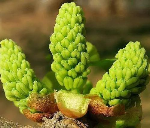 雄株花芽大而饱满,顶部稍平;雌株花芽瘦而尖。雄花花序为柔荑花序,外形像桑葚;雌花长在花顶端,分作两杈,外形像火柴梗状。