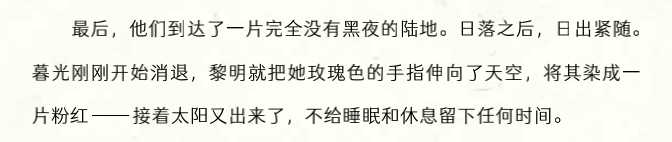 除了对暴力血腥描写的处理,吉莲·克罗斯在全文的表述中都尽力使用孩子看得懂的语言,但是在通俗易懂的同时,也保留了一些原文中典雅的金句,比如在描写天亮时,文中使用了原文的“黎明把她玫瑰色的手指伸向天空”“深酒色的大海”等典雅深邃的经典词句,以精湛传神的笔法让孩子感受西方文明基石经久不衰的文学魅力。
