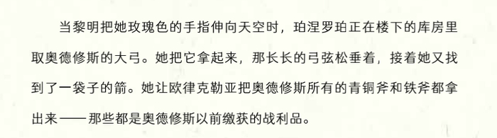 荷马史诗的两个故事分别讲述战争和冒险,原文免不了一些血腥的描写,而吉莲·克罗斯将这个故事的血腥程度降到了最低,而没有失去其力量、凶猛和情感的冲击。大家可以看下对比。