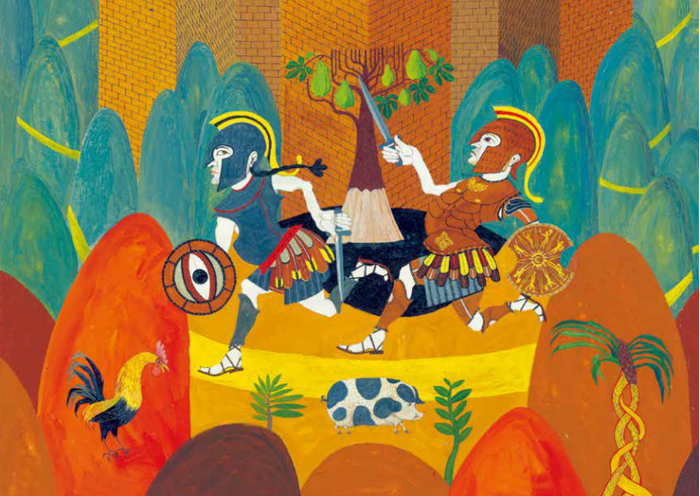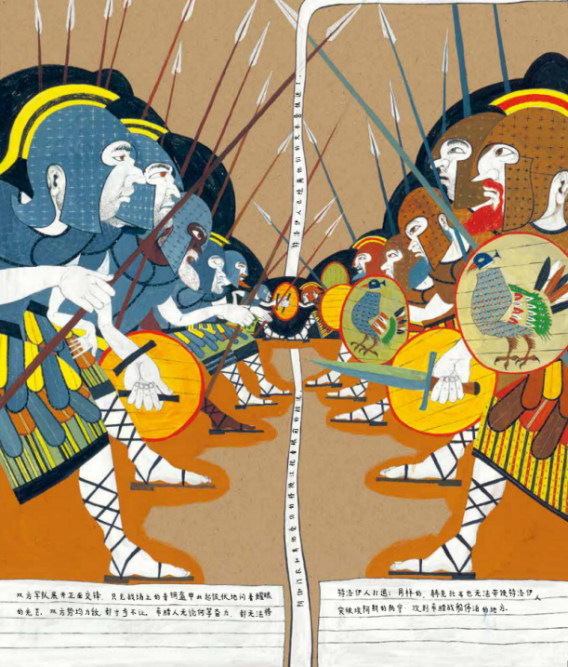这段描写大胆直白、毫不避讳地描写了战争的场面,极富冲击力,但是过于赤裸的语言,让成年人也倒吸了一口凉气。再看一下《荷马史诗绘本版:伊利亚特》中对应的片段: