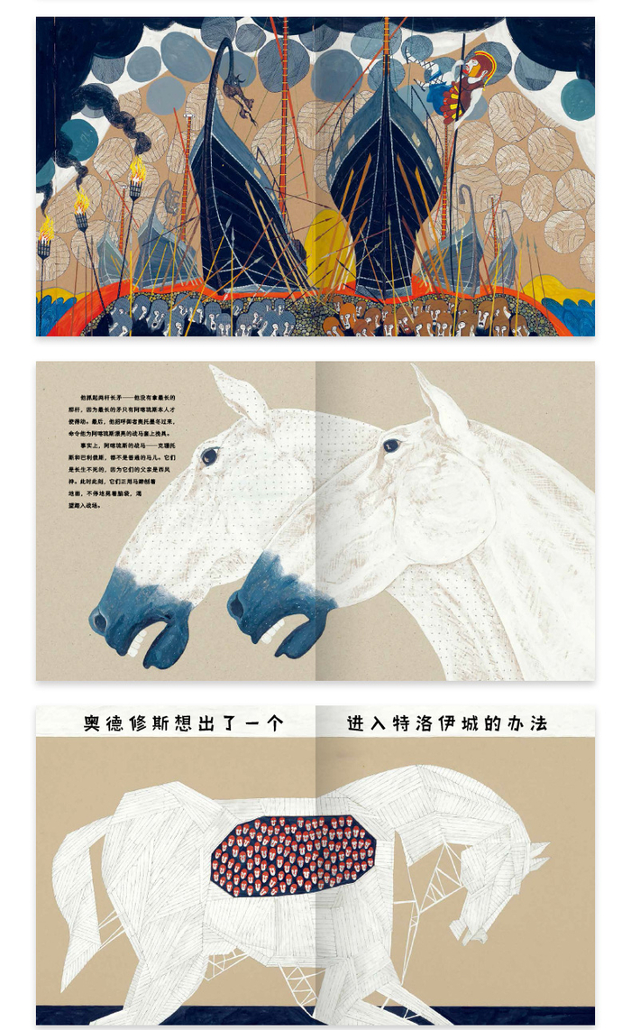 来看看《伊利亚特》和《奥德赛》,阔朗的16开大开本精装,140克的厚实内文纸,色彩鲜亮、细节清晰,如实还原了插画的质感。