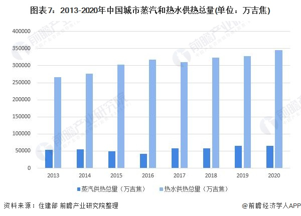 首先从城市供热总量来看,我国城市供热总量呈波动上升的趋势。据住建部数据显示,2020年,我国城市蒸汽供热总量为65054万吉焦,热水供热总量为345004万吉焦,分别同比2019年变化了-0.02%和5.35%。