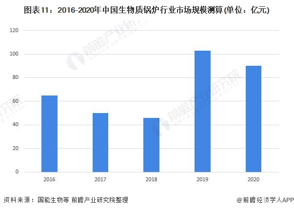 中国生物质锅炉行业主要应用在供热和发电两大领域,由生物质热能锅炉和生物质电能锅炉构成,是目前我国生物质能应用的重点产品。根据国能生物发电集团披露的生物质电能锅炉采购成本比例,以及我国生物质热能锅炉蒸吨量和锅炉价格行情等信息,测算得出2016-2020年,我国生物质热能锅炉和生物质电能锅炉的市场规模呈波动上升的态势,2020年我国生物质锅炉行业市场规模约为90亿元。