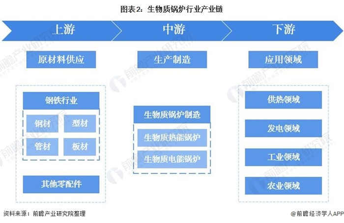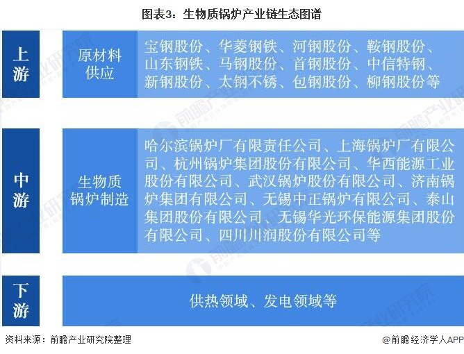 生物质锅炉产业链上游主要是钢材等原材料供应,其中主要企业为国内各大钢企,包括宝钢股份、华菱钢铁、河钢股份、鞍钢股份、山东钢铁、马钢股份、首钢股份、中信特钢、新钢股份、太钢不锈、包钢股份、柳钢股份等。而产业链中游则是生物质锅炉的生产制造,主要企业有哈尔滨锅炉厂有限责任公司、上海锅炉厂有限公司、杭州锅炉集团股份有限公司、华西能源工业股份有限公司、武汉锅炉股份有限公司、济南锅炉集团有限公司、无锡中正锅炉有限公司、泰山集团股份有限公司、无锡华光环保能源集团股份有限公司、四川川润股份有限公司等;下游则是供热、发电等领域的应用。