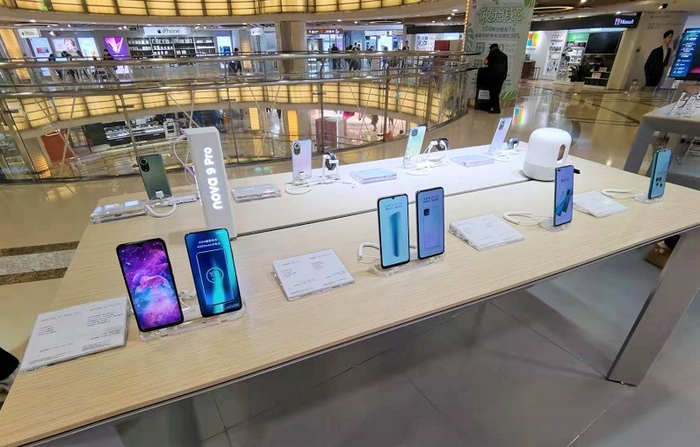 北京市西城区某华为线下门店内陈列着NZONE等智选手机样机。