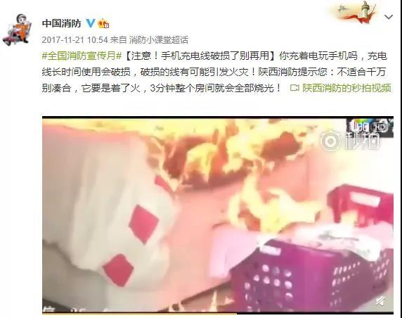 中国消防官微发布的一段视频显示:用破损的充电线充电引发火灾,从小火星到全屋燃烧,仅用了3分钟时间。