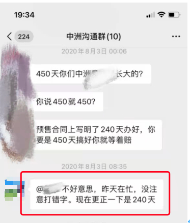 “并且2020年8月部分业主对延迟交房事项进行协商时,中洲的工作人员还曾承诺办证时间是240天。”