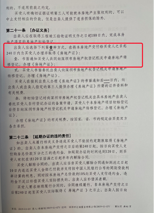 开发商与业主签署的主合同第二十一条【办证义务】中约定:“出卖人应在将本房地产交付给买受人之日起240日内为买受人办理并取得《房地产证》。”
